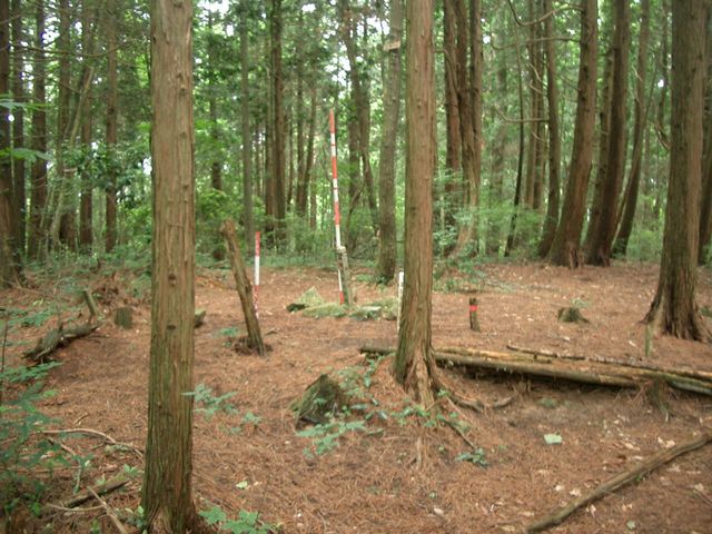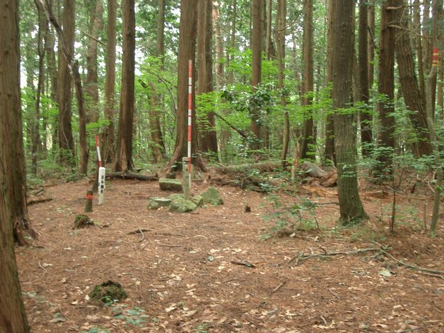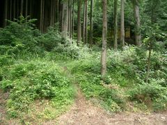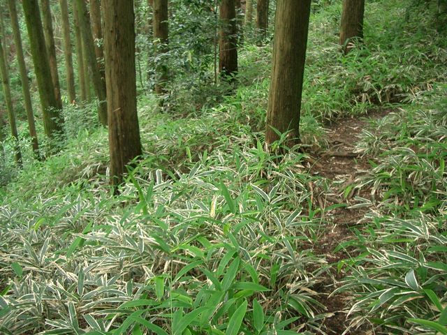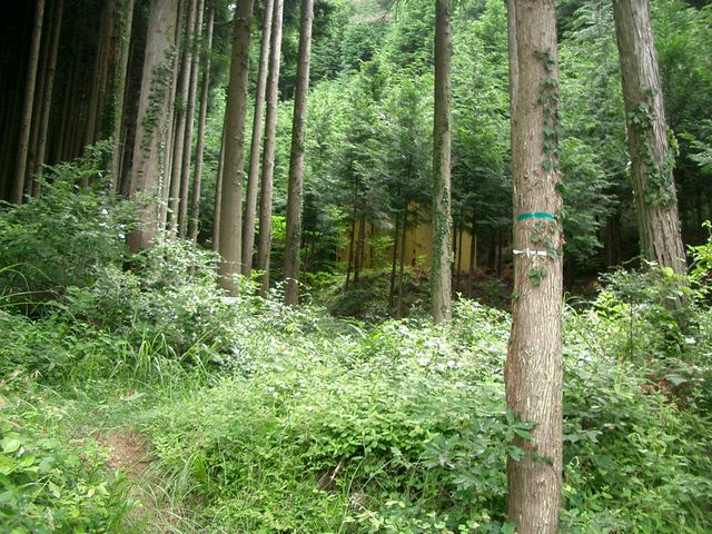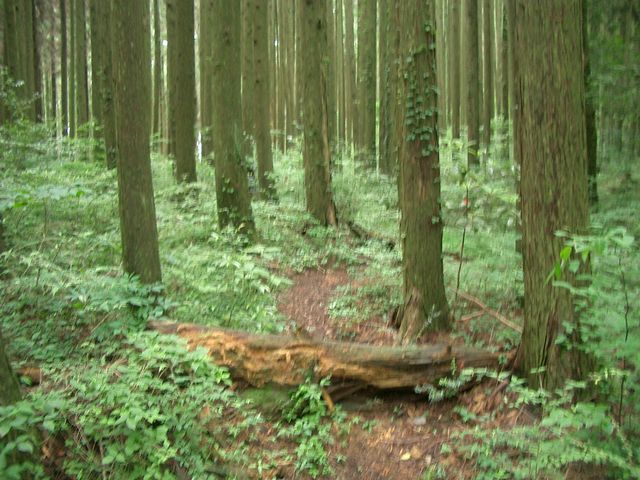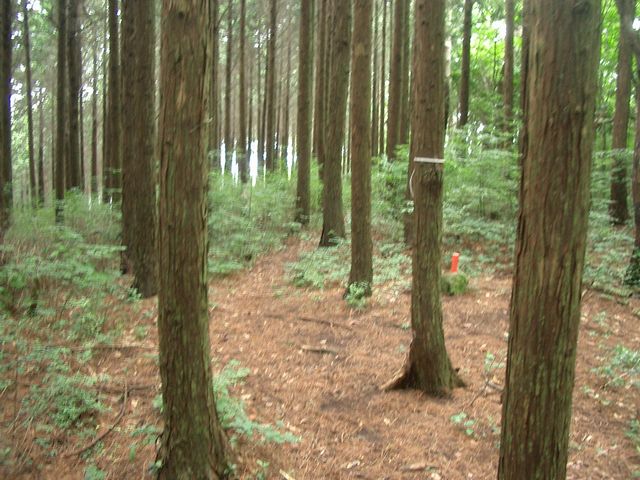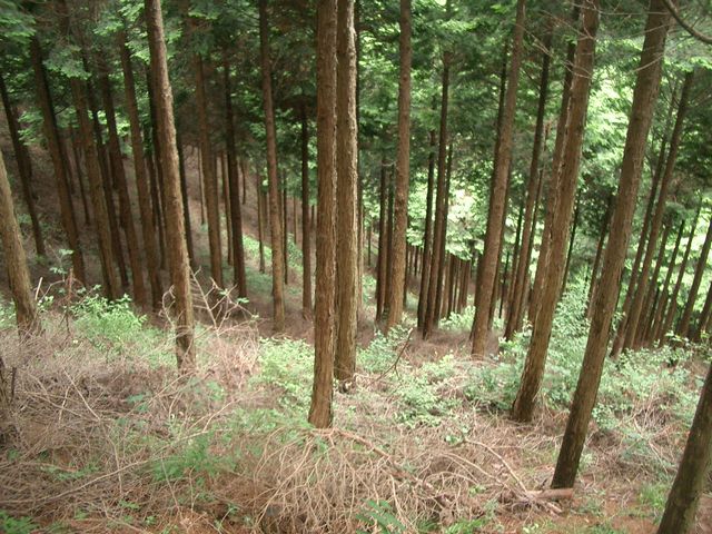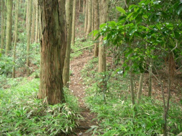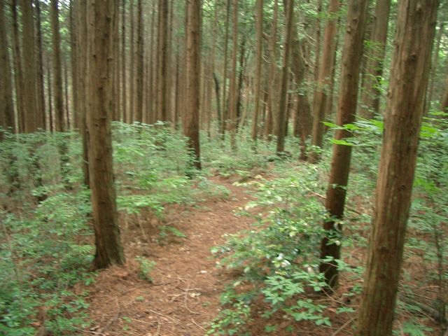 また杉林の中に入って行く。写真では判りづらいが前方は急な坂道だ。 |