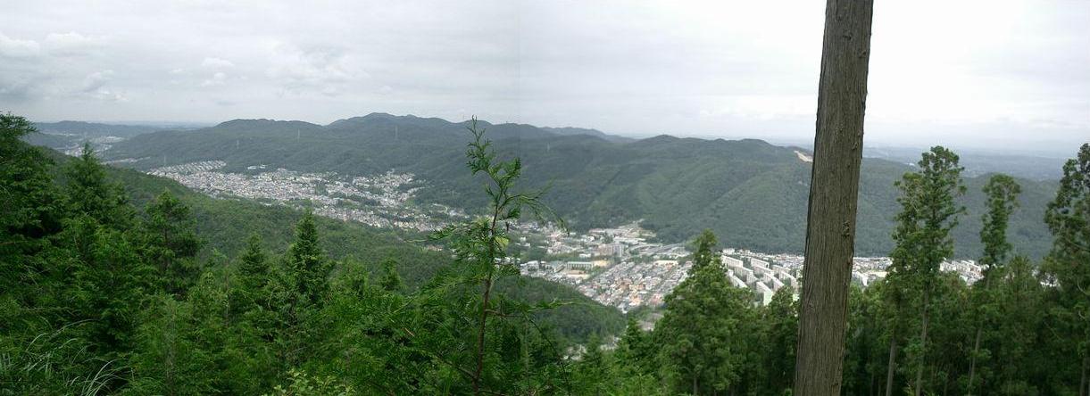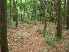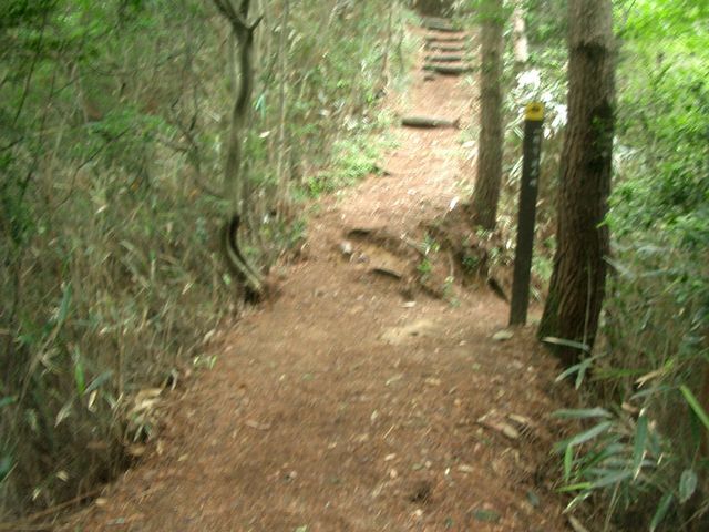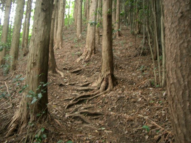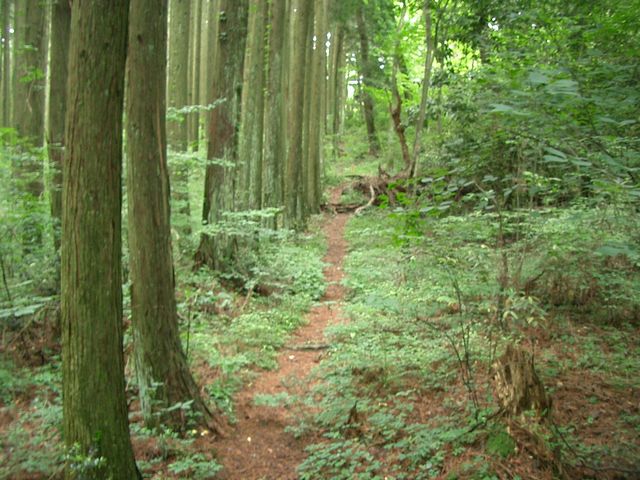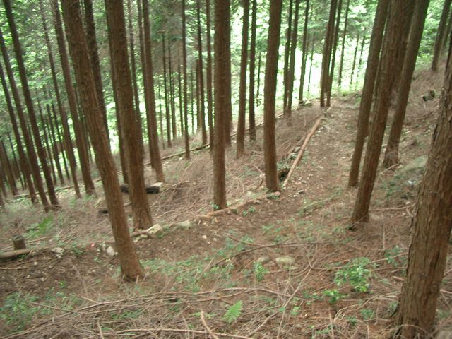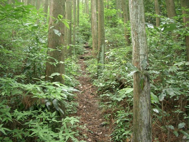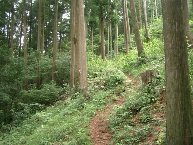 杉林の中の急斜面に設けられた九十九折れの道を登って行く。一旦杉林を抜け、北方向に眺望が開けるが、それも束の間、すぐにまた林の中へと急な坂道が続く。