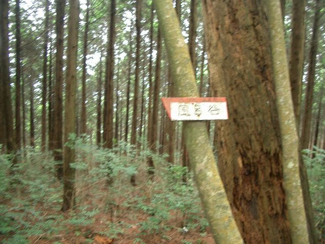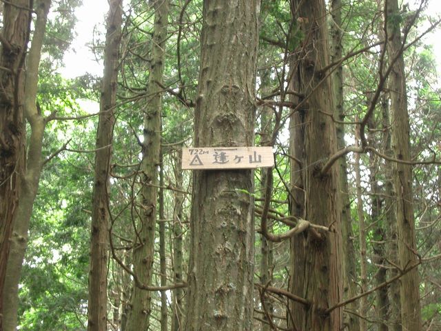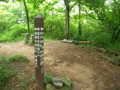 逢ケ山の頂上は平坦な所で、展望の効かぬ木々の中にある。そこかしこの木々に取り付けられた登頂記念プレートと三角点が頂上であることを示している。