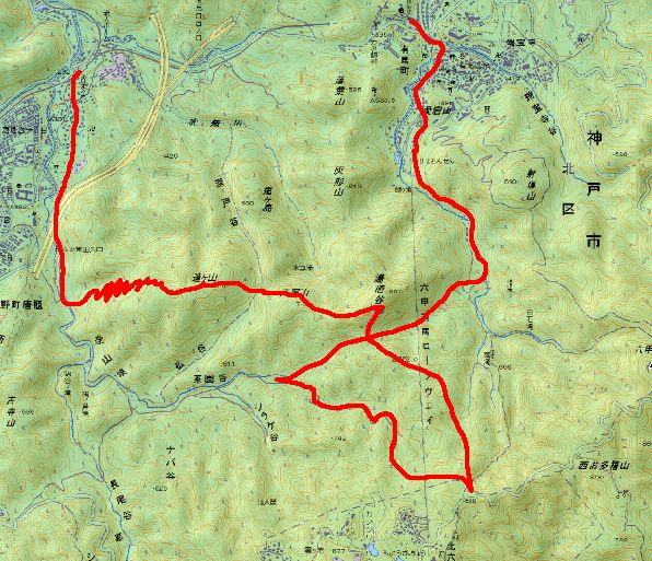 紅葉谷との出合いに着き、林道を有馬温泉へと下る。途中家族に無事の連絡を入れる。銀の湯に立ち寄ろうかと思ったが、のんびりと入浴している間に天気がもっと悪くなっても困る。