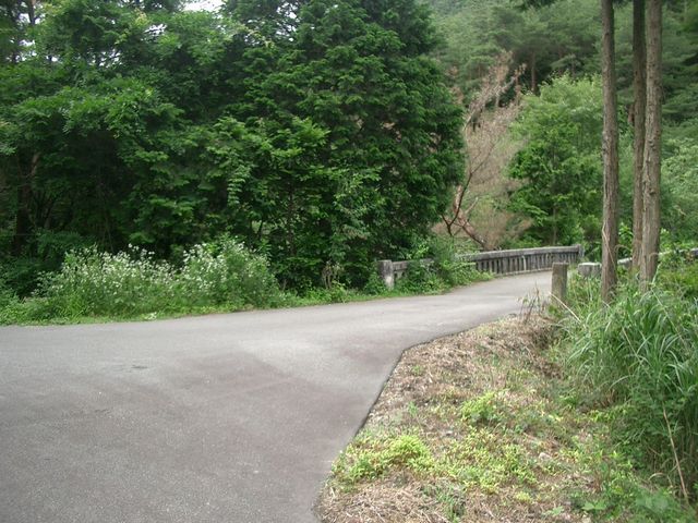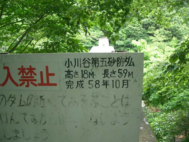 谷沿いの道はわずかで堰堤にぶつかる。左手の巻き上げ道で堰堤を越えたと思ったら、その先には舗装された林道が待ち構えていた。小川谷の道は林道歩きと言われているらしいが、その林道だろう。