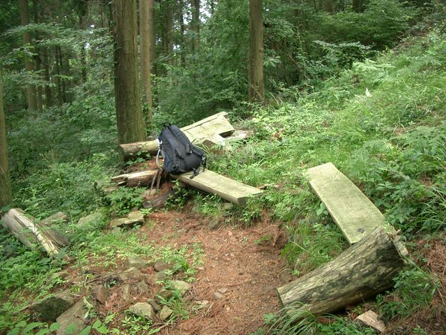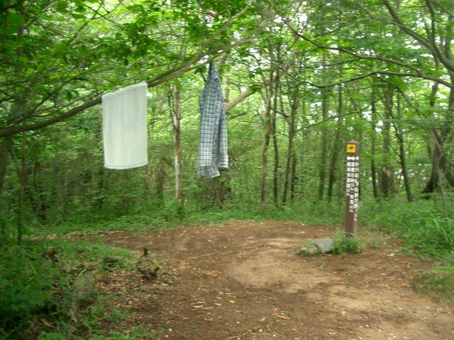 番匠屋畑尾根を登りきり小川谷への分岐点に付く。ここはちょっとした空き地で木々に囲まれ雨漏りの心配も無い。一旦、極楽茶屋まで行き、水を購入しここに戻り、持参したインスタントラーメンで昼食とする。