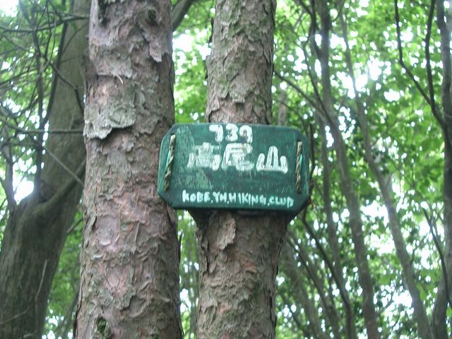 高尾山頂上も木々の中で展望は効かない。頂上からは三方に下り道が延びている。今登って来た仏谷峠に下る道、北方向に水無峠に下る道、東方向に湯槽谷山から湯槽谷峠に向かう道。今日は湯槽谷峠へと下る。