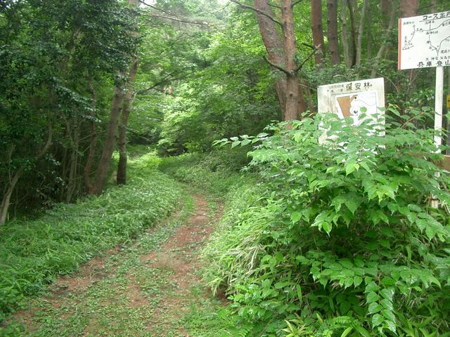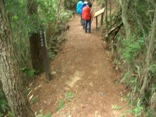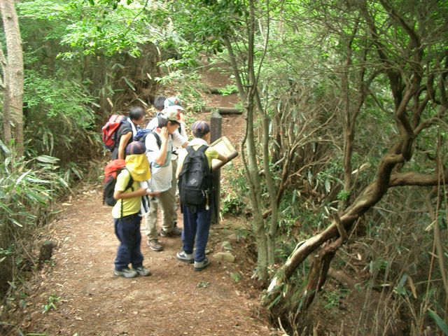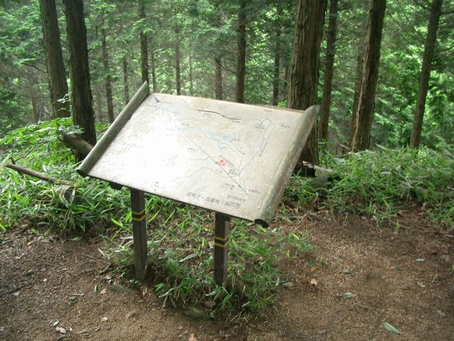 ロープウェー鉄塔直下から残りの半分程の地点、コース案内板がある所に来ると、先に歩いていた子供達が昼食休憩を始める所であった。ここで追い越して先に進む。
