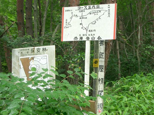 ここには、兵庫登山会が設置してくれたあの見慣れたコース案内板があった。湯槽谷峠まで30分と書かれている。時刻はまだ13時過ぎ。雨も大したことは無い。有馬温泉には2時半には充分着けそうだ。