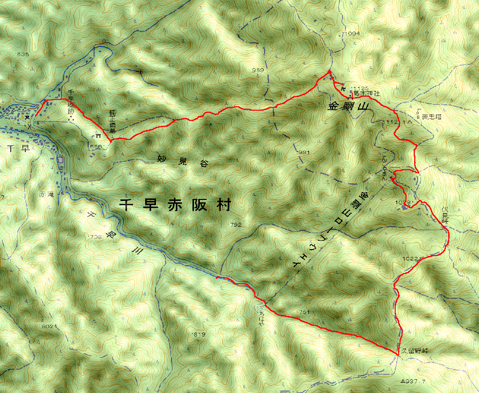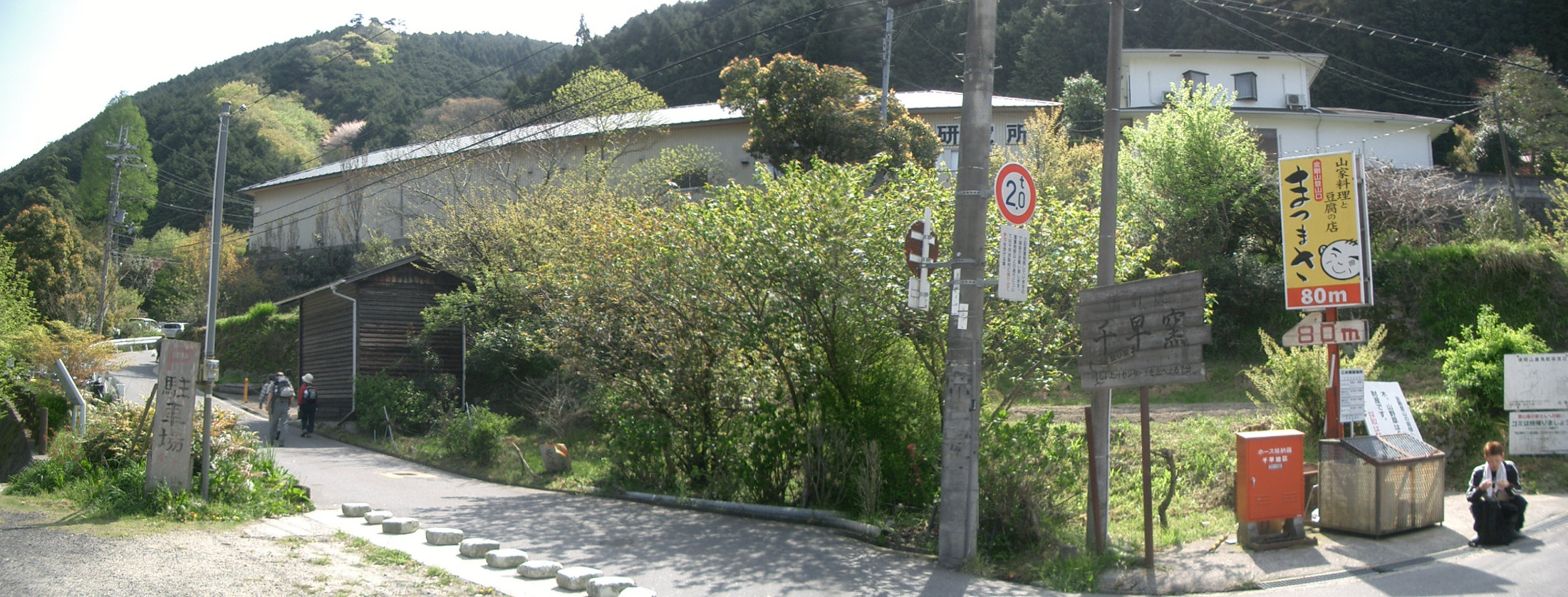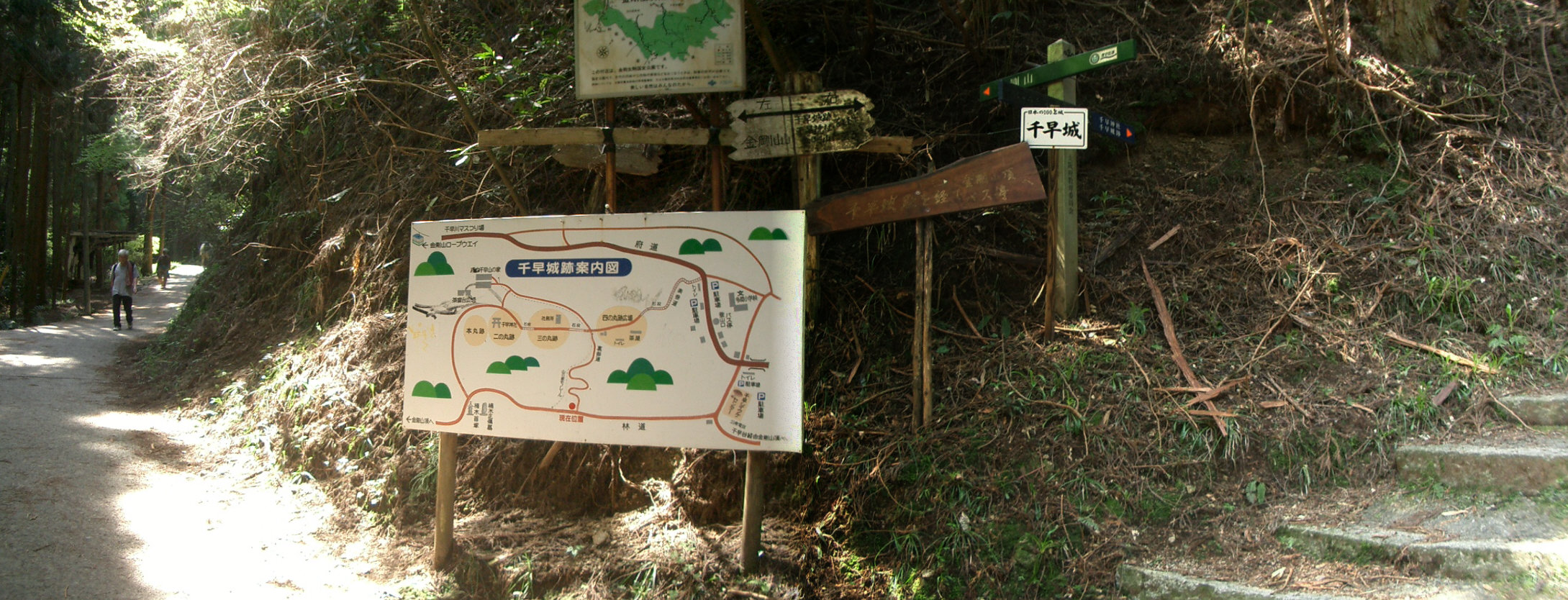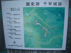 バス停から少し進み千早城跡の案内板を眺める。城跡を巡ると時間がかかりそうなので谷道で登ることにする。 |