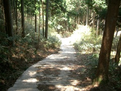 | 水平な道はこんなに広い。前方から丸太階段がまた始まる。 |