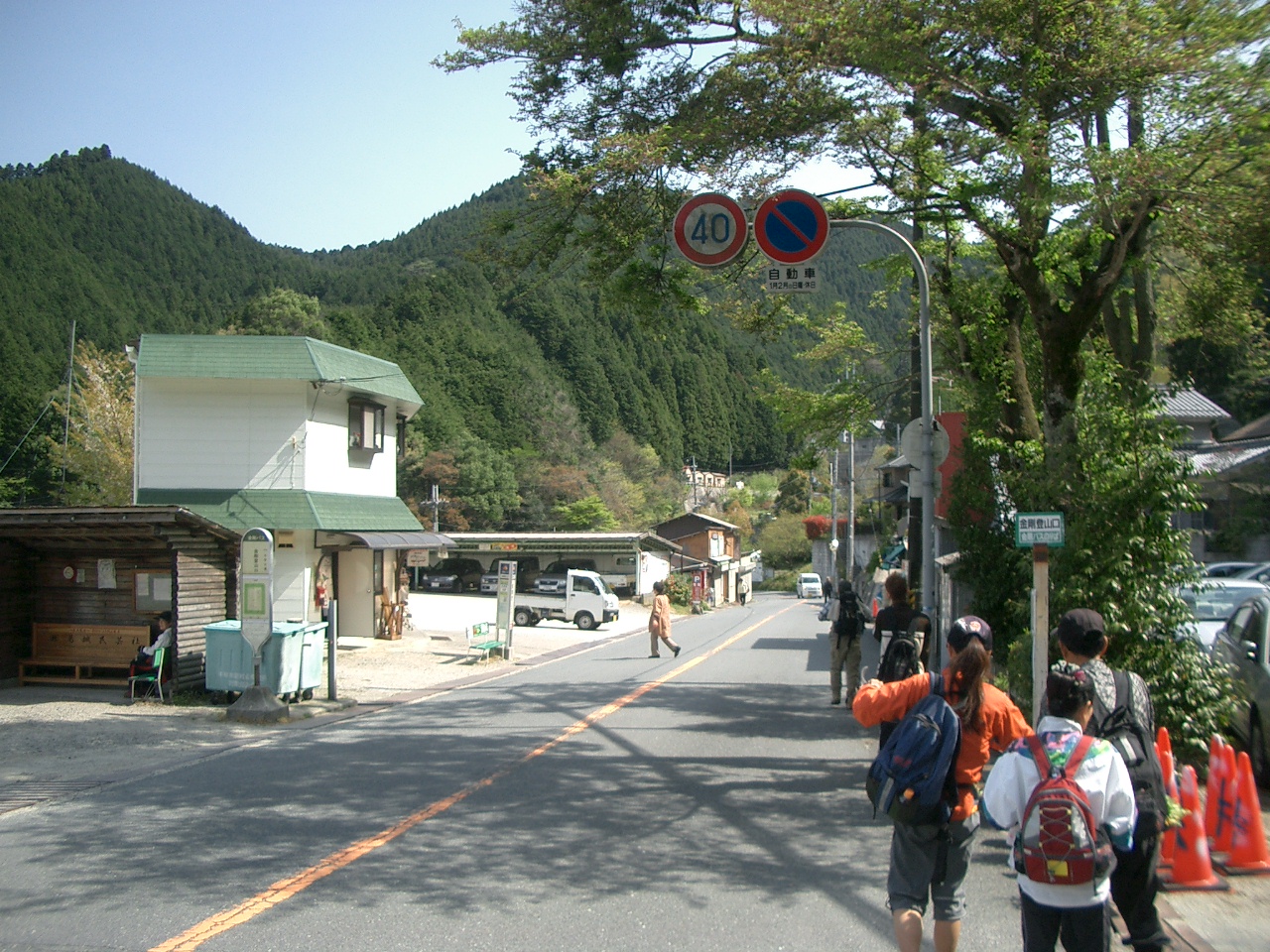 | バス停を少し戻る。他のハイカーも谷道に向かう。 |