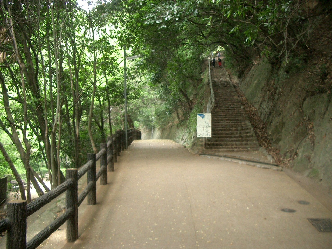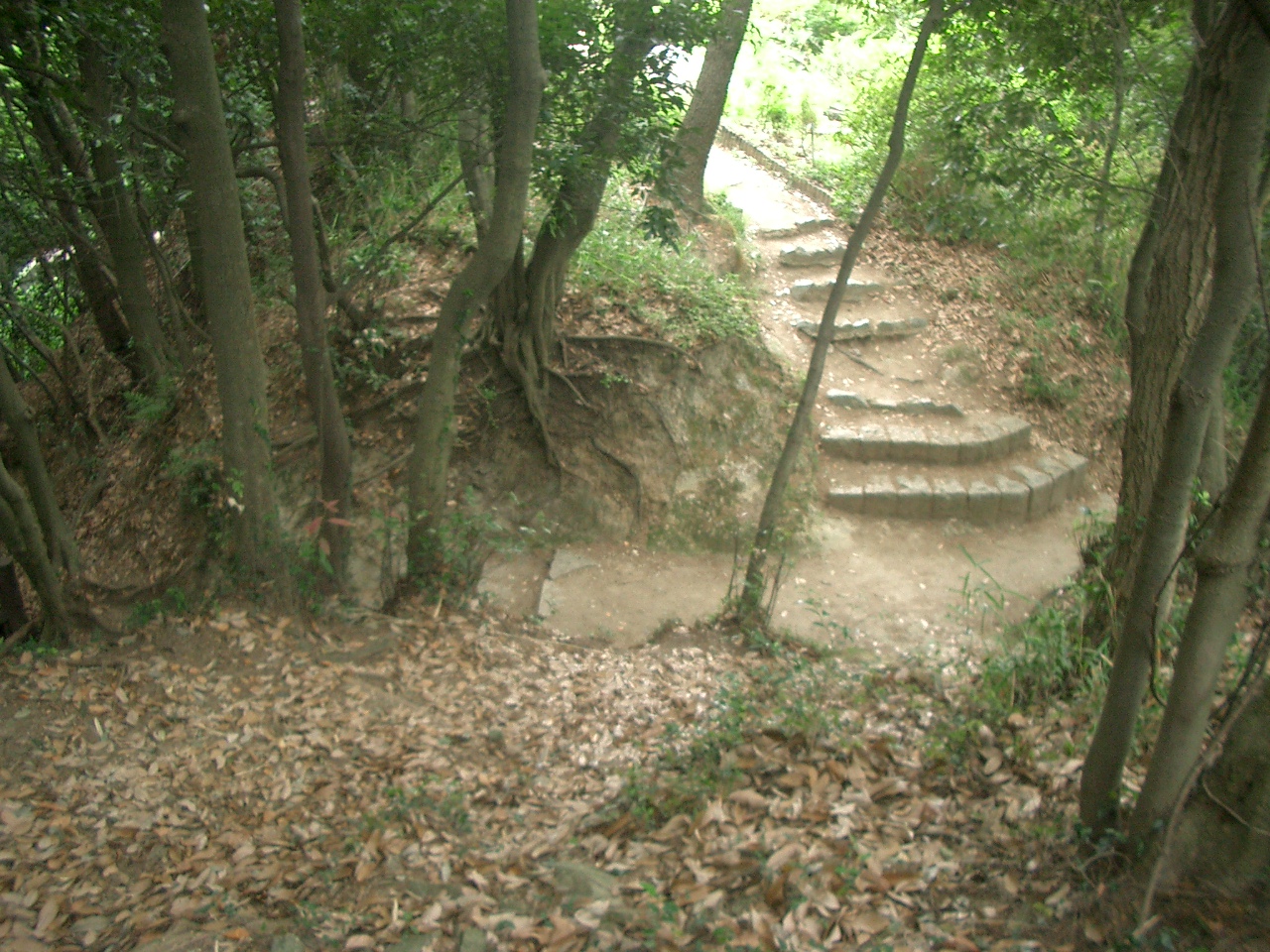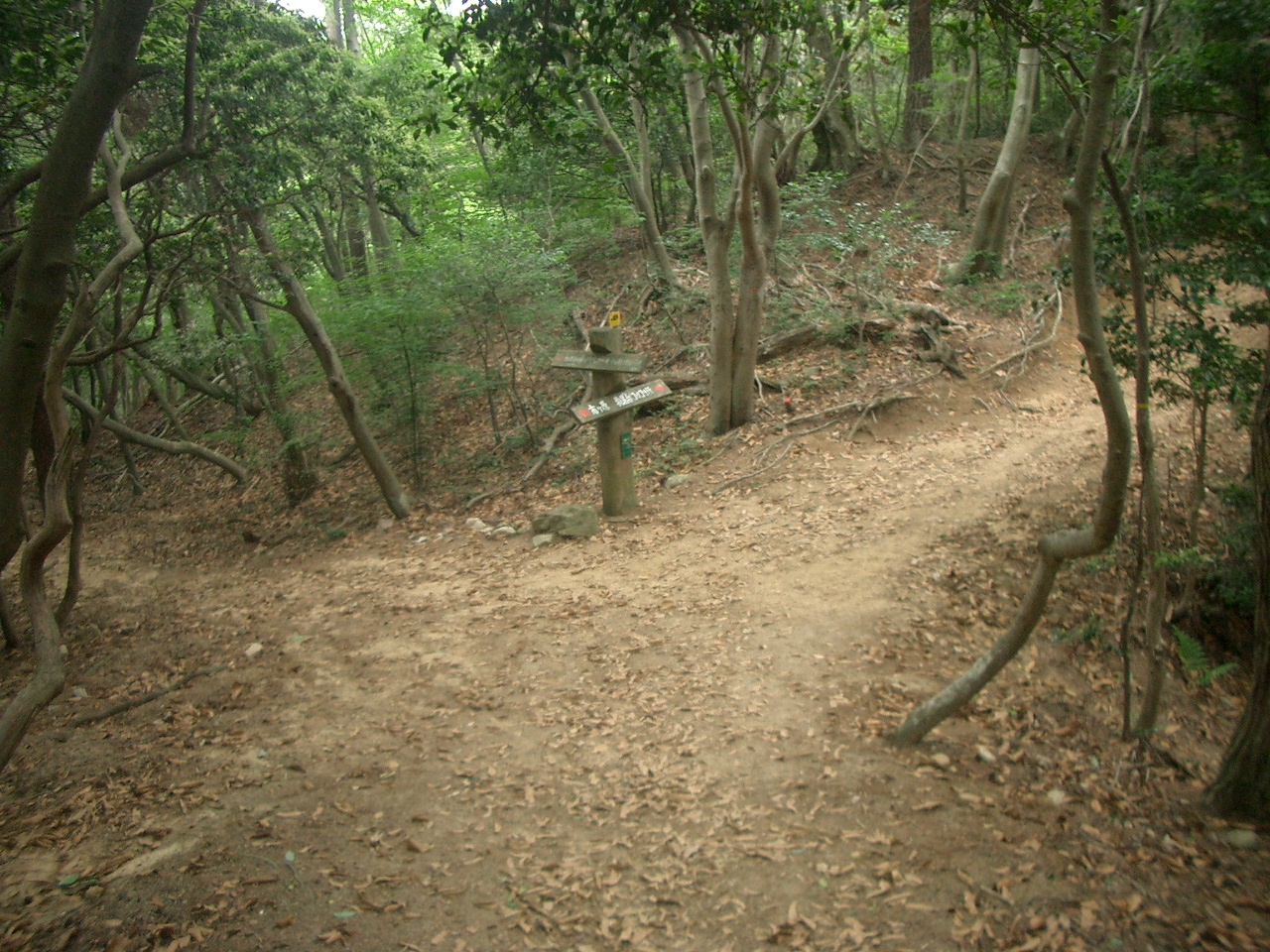 | 頂上から急坂を下るとここに降りてきた。左に行くとケーブル駅、右に行くと神戸高校だ。左に進む。 |