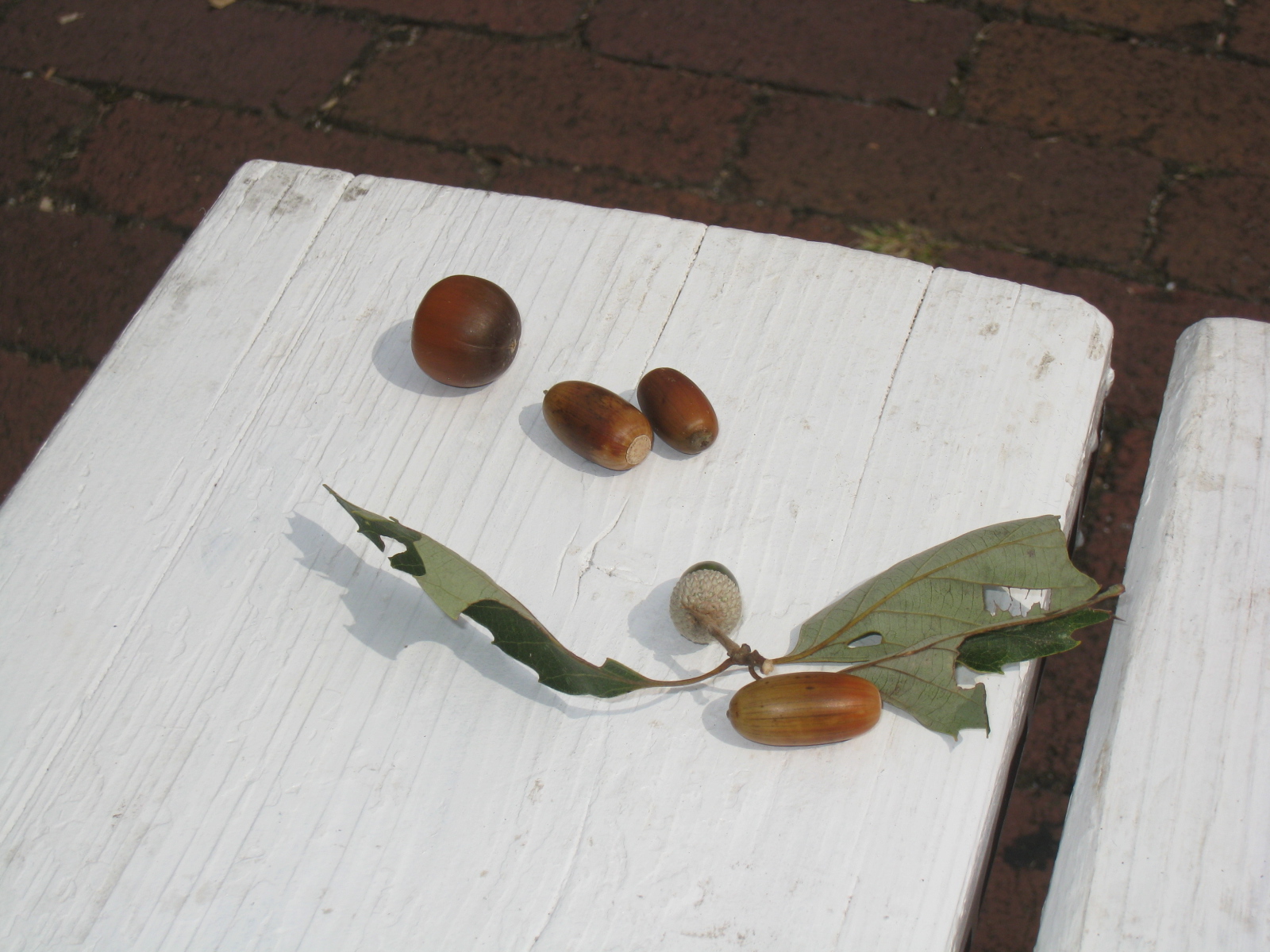 | 誰がおいたかベンチにドングリの実がありました。 |