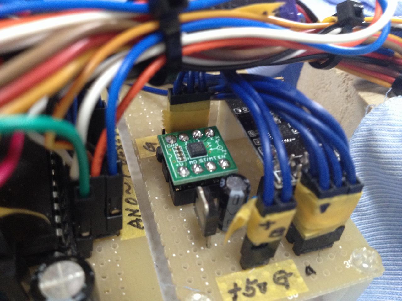5.測距センサーと加速度センサーの取り付け <測距センサー> ロボットの歩行時における壁などへの衝突防止のために、シャープの測距センサー「GP2Y0A21YK」をロボットの前部と後部に取り付けました。 このセンサーは、アナログ電圧出力ですので、マイコン制御ボードのアナログ入力端子に接続しました。センサー感度は、約15cmで、障害物を検出するようにしました。 ラジコンでロボットを歩行させている時、壁に15cmほどに近づくと停止します。ここで自動的に後退させるなどの動作をプログラムすることもできましたが、今回は、オペレータの判断を待つという仕様にしました。 <加速度センサー>4足歩行ロボットでは、転倒などの心配はありませんので、2足歩行ロボットのようなジャイロセンサーや加速度センサーによる姿勢制御は必要ありませんが、お遊びとセンサーの使い方の学習を目的に加速度センサーを取り付けてみました。 こちらの加速度センサーも使ったものは、アナログ出力のものです。X軸、Y軸、Z軸の3方向の加速度が計測できます。 加速度センサーは、ロボット歩行中の加速度を計るのではなく、停止中に、外部から胴体に力が加えられたかどうかを検出することに使うことにしました。 停止している時に、ロボットの前部を手で叩いてやるとそのショック(0.5Gオーバー)を検出し後退を始めます。逆に、後部を叩いてやると前進を始めます。その後の動作はラジコンで操縦します。