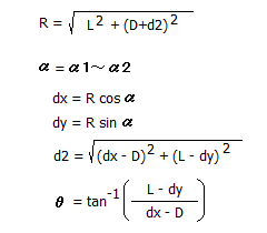 旋回開始時点では、足先が左右に水平に伸びているものとします(モーター0の回転角度が0度)。 この時のd2を使って半径Rを決定し、適当な角度α1からα2まで足先を移動させた時、各移動先の座標をP(dx、dy)としますと、下記のような計算式で、モーター0の角度θや、足先の距離d2を求めることができます。