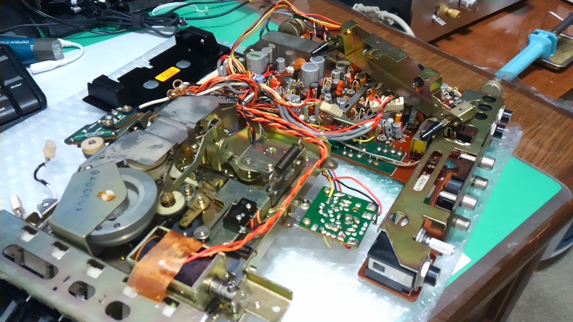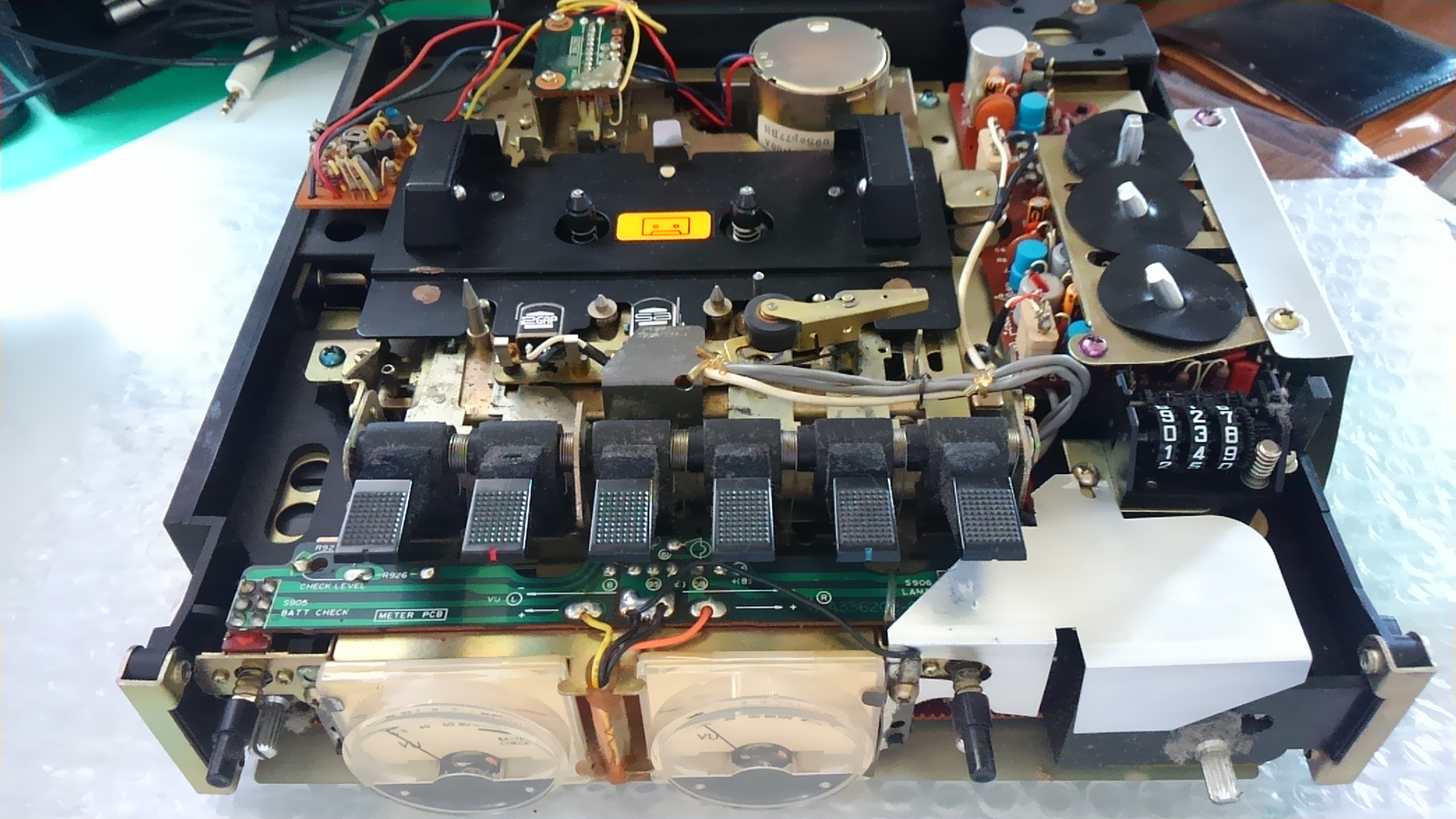 カセットメカです。キャプスタンベルトは裏側にあります。レバーやメカの埃は拭き取りました。 |