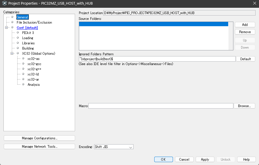 X IDE の言語設定は SHIFT JIS です.(設定画面)