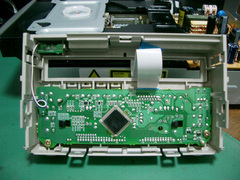 P-ON端子とE+5V端子を1kΩの抵抗で接続し、+3.3VやSW+5Vを出力させてそれぞれの電圧をテスターで測定してみたが特に異常は見当たらない。 電源ユニットに特に回路上の不具合は発生していなさそうだ。ちなみに回路を追いかけて見ると次のようであった。 ユニット中央のトランスの2次側にある複数の巻線の一つから交流出力をダイオードで整流し、平滑用の電源コンデンサを通して メカ用のM+6Vが作られていた。もう一つの巻線からは、+3.3Vの元になる4Vの電圧が同じような回路で作られていた。 この2つの平滑用電解コンデンサの頭が膨れているのだ。 メカ用のM+6Vの電源からは、さらにダイオードで電圧をシャントしマイコン用のE+5Vが作られ、また4端子の電源レギュレータICを 通してSW+5Vが作られていた。4端子の出力制御端子は、P-ONに接続され、マイコンで出力制御されていた。 +3.3Vも同様に4端子レギュレータICを通して4Vから生成されていた。もちろん、こちらも出力制御端子はP-ONに繋がりマイコンで制御されている。 V+12Vや、-27Vなどは、別の巻線からディスクリート回路で作られていた。 3. マイコン基盤の調査 .... 別電源で動作良好