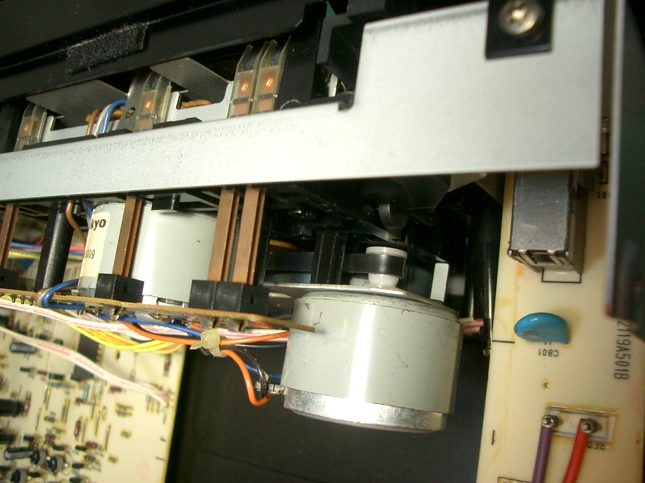 ついでに、デジカメで、ヘッド付近にあるテープエンドを検出するという赤外線センサーが発光しているか 確認してみたが、発光しているのかいないのかよく判らなかった。 清掃、といっても拭くだけで済みそうだが、に取り掛かる前にケースカバーを開けて中を覗いて見ることにした。 ジャンク修理で、一番ワクワクする瞬間だ。 このデッキ、GX-73と違ってケースカバーに放熱口が設けられていないので中は至って綺麗だ。埃は全然ない。大きな基板が一枚と カセットメカだけのシンプルな構成でスカスカ状態だ。SONYのTC-RX715や VictorのTD-V505と同様だ。録音ボリュームを廻す モーターは、基板に取り付けてあった。 年代が新しくなると、マイコンへの機能依存が高くなり部品点数が少なくなる。さらにICなどの集積度があがるので、どうしても ケースの中はスカスカとなる。